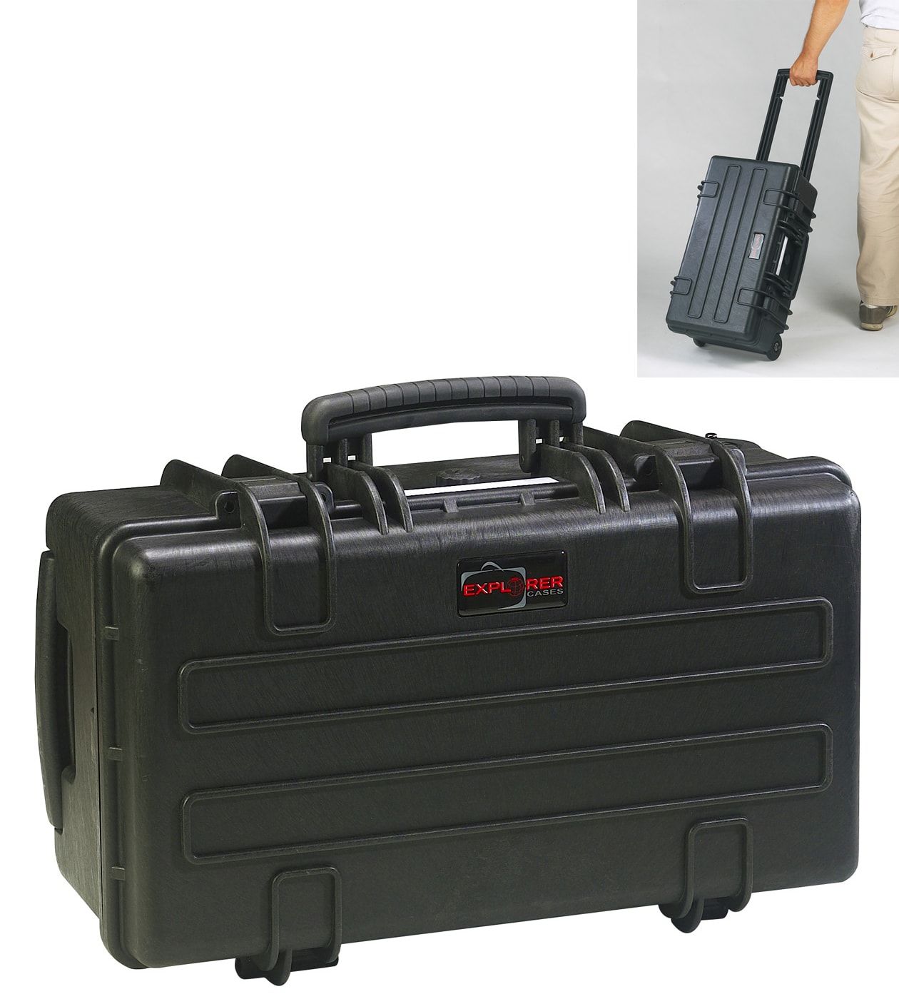 Тяжелые кейсы с колесами и телескопической ручкой. Уплотнительное кольцо и съемная крышка. Поставляется пустым или с поропластом в нижней части и в крышке. Самосмазывающиеся свободно вращающиеся колеса.